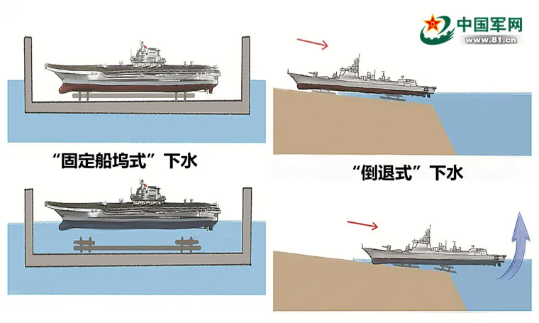 船坞下水,就是舰船在干船坞里建造,建造完毕之后给船坞注水让它自己漂起来,然后用拖轮拖曳下水,或者先将舰船转移到浮船坞上,然后用浮船坞将船转移到岸边、浮船坞下沉后脱离,船体自然就漂浮起来了。在胡强生看来,船坞下水是最好的下水方式,它的安全性特别好,不会导致船体变形。但缺点是船坞造价高昂,而且很多国家严格控制建造大型船坞。